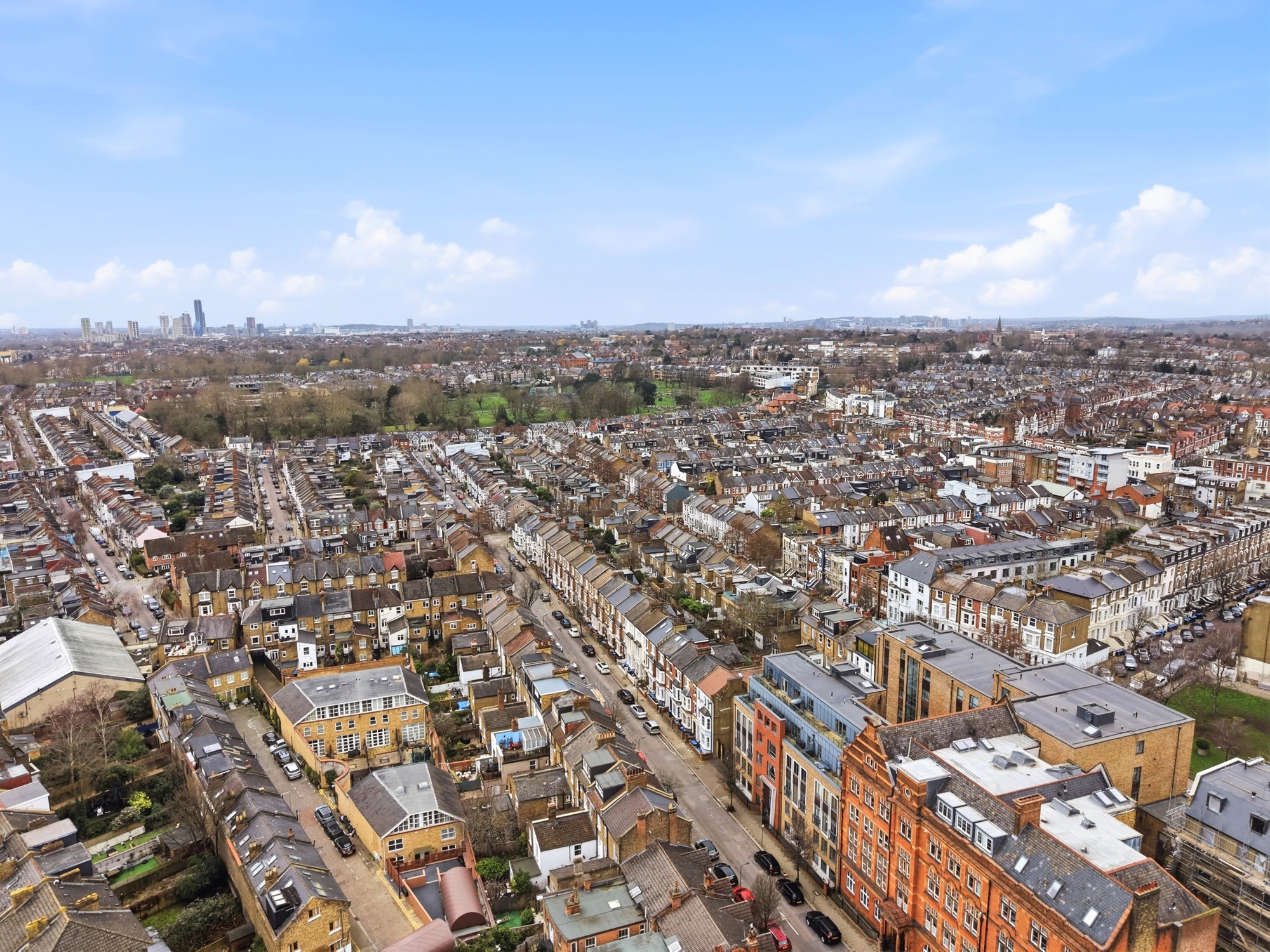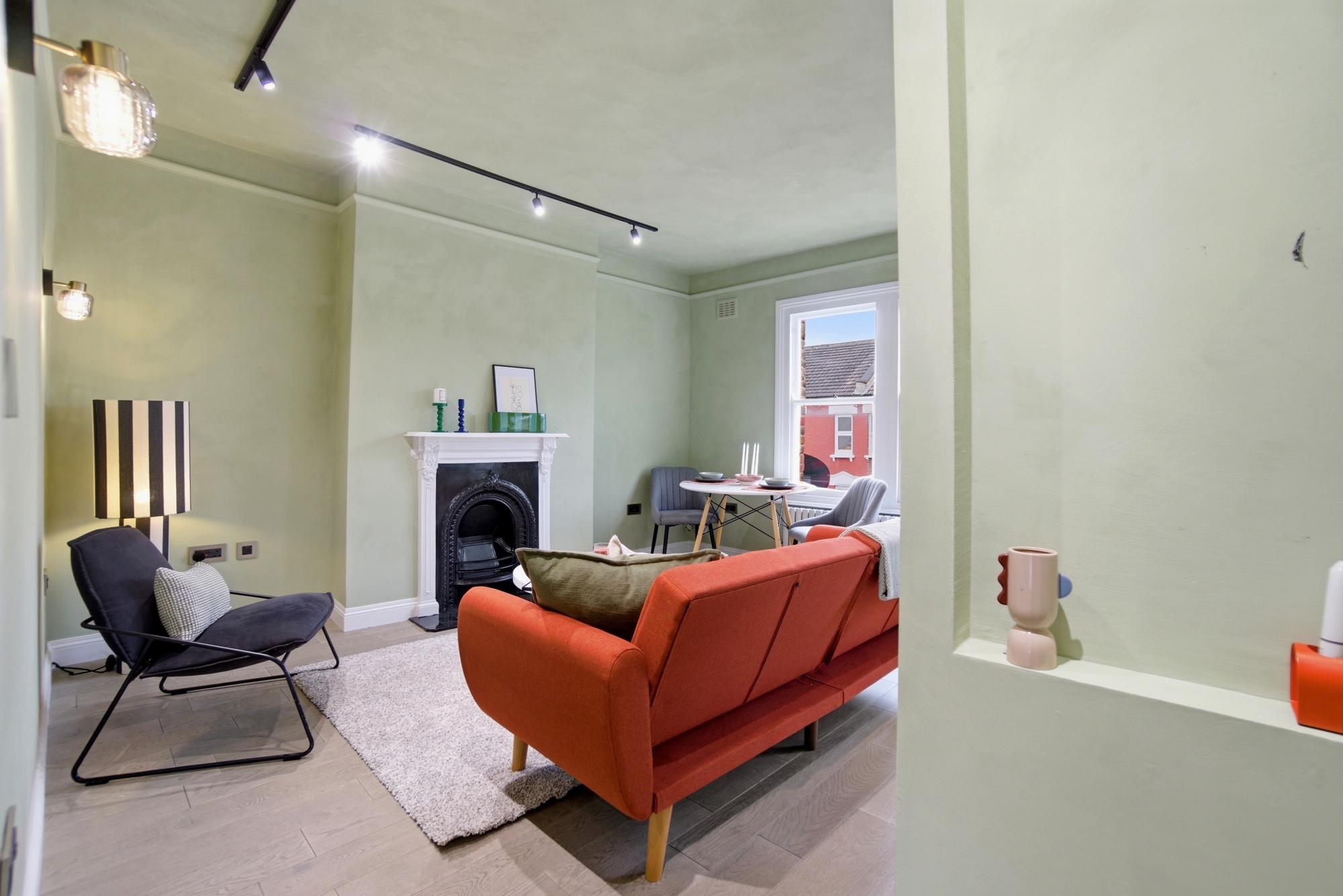 This newly developed home features a bright open-plan reception and kitchen area, enhanced by large sash windows that flood the space with natural light and provide attractive rooftop views. The interiors are finished in soft, modern tones, creating a calm and welcoming atmosphere throughout. The living area is perfectly proportioned for both relaxing and entertaining, complemented by elegant wood flooring and contemporary track lighting.