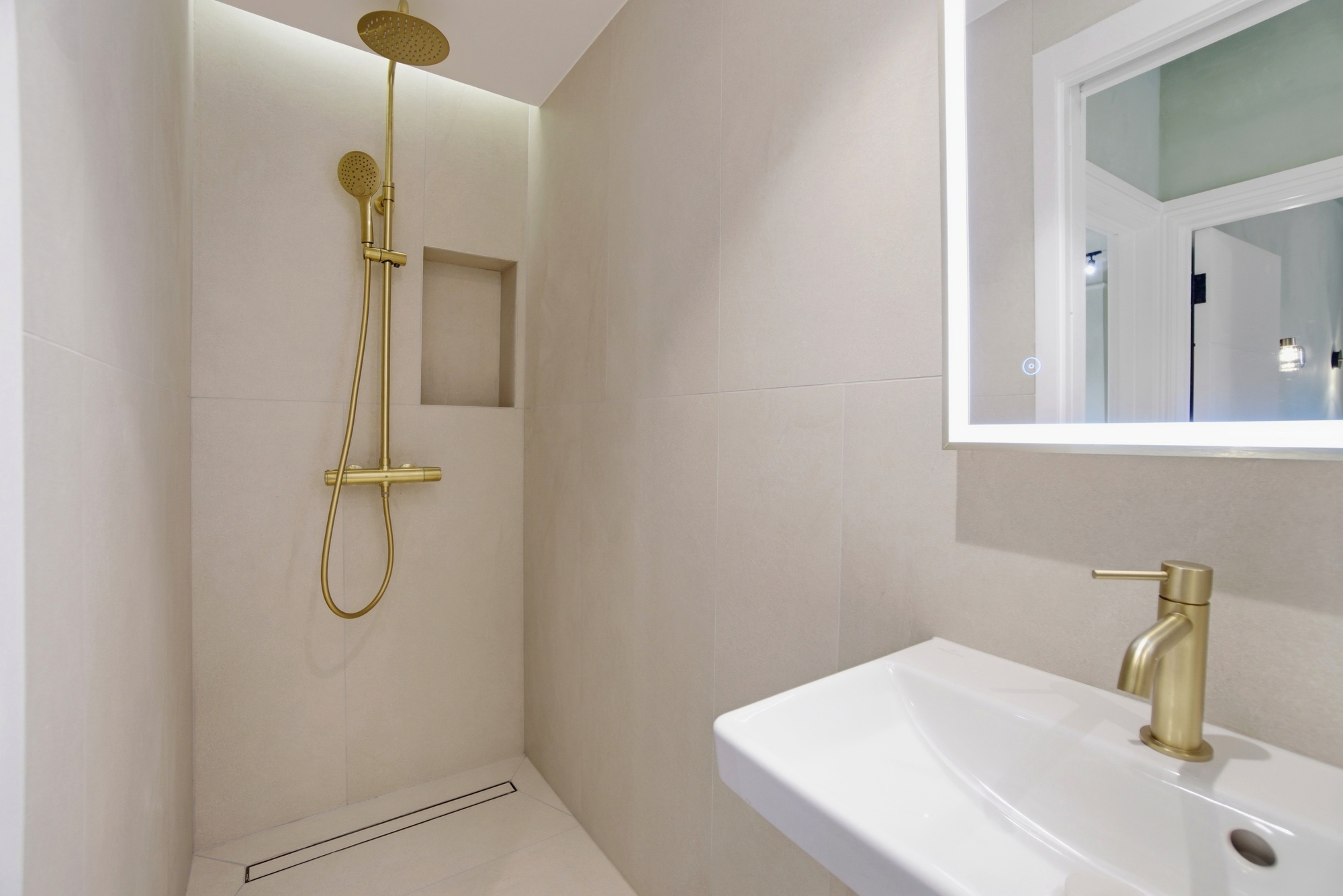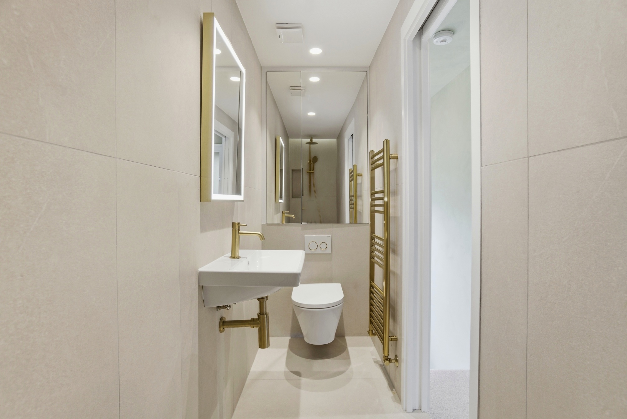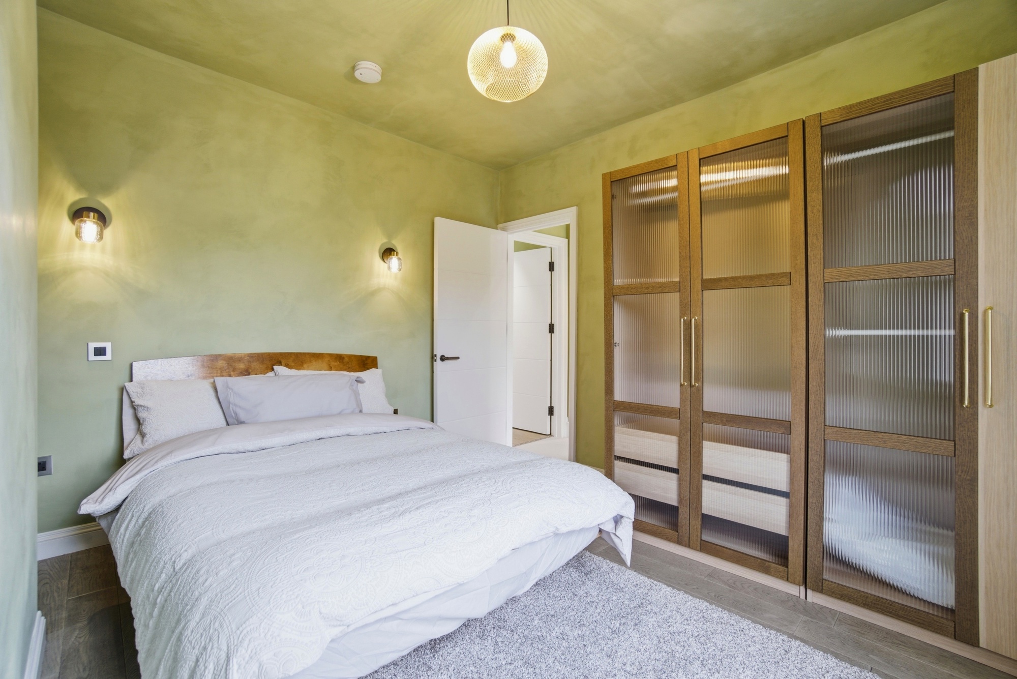 The spacious double bedroom continues the apartment’s sophisticated aesthetic, featuring fitted wardrobes with stylish reeded glass panels and warm wood detailing. Soft lighting and carefully chosen finishes create a tranquil retreat. The bathroom is finished to a high standard with modern fittings and a clean, minimalist design.
