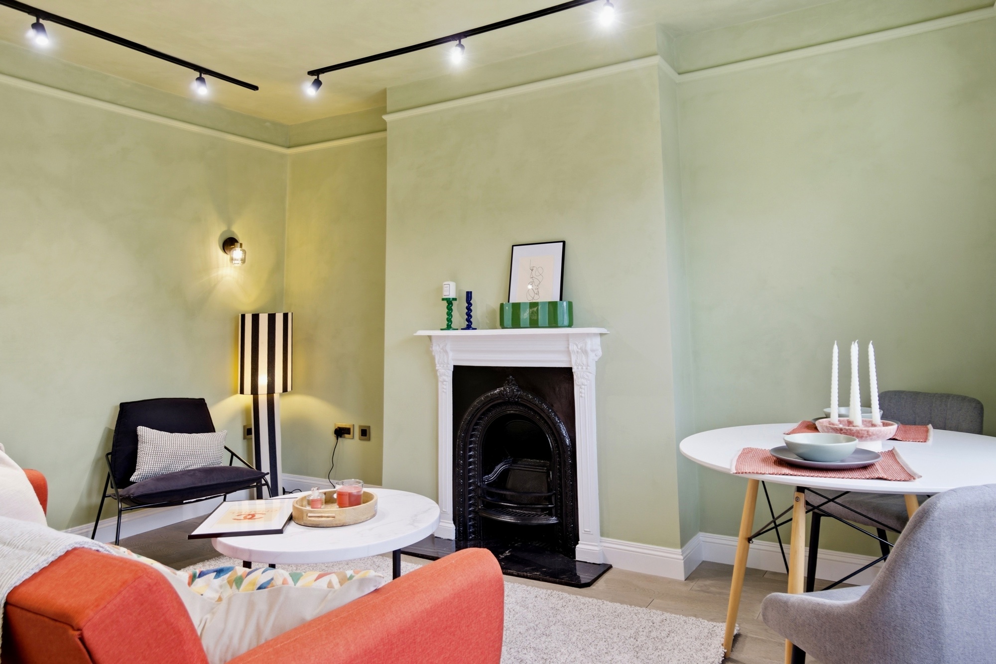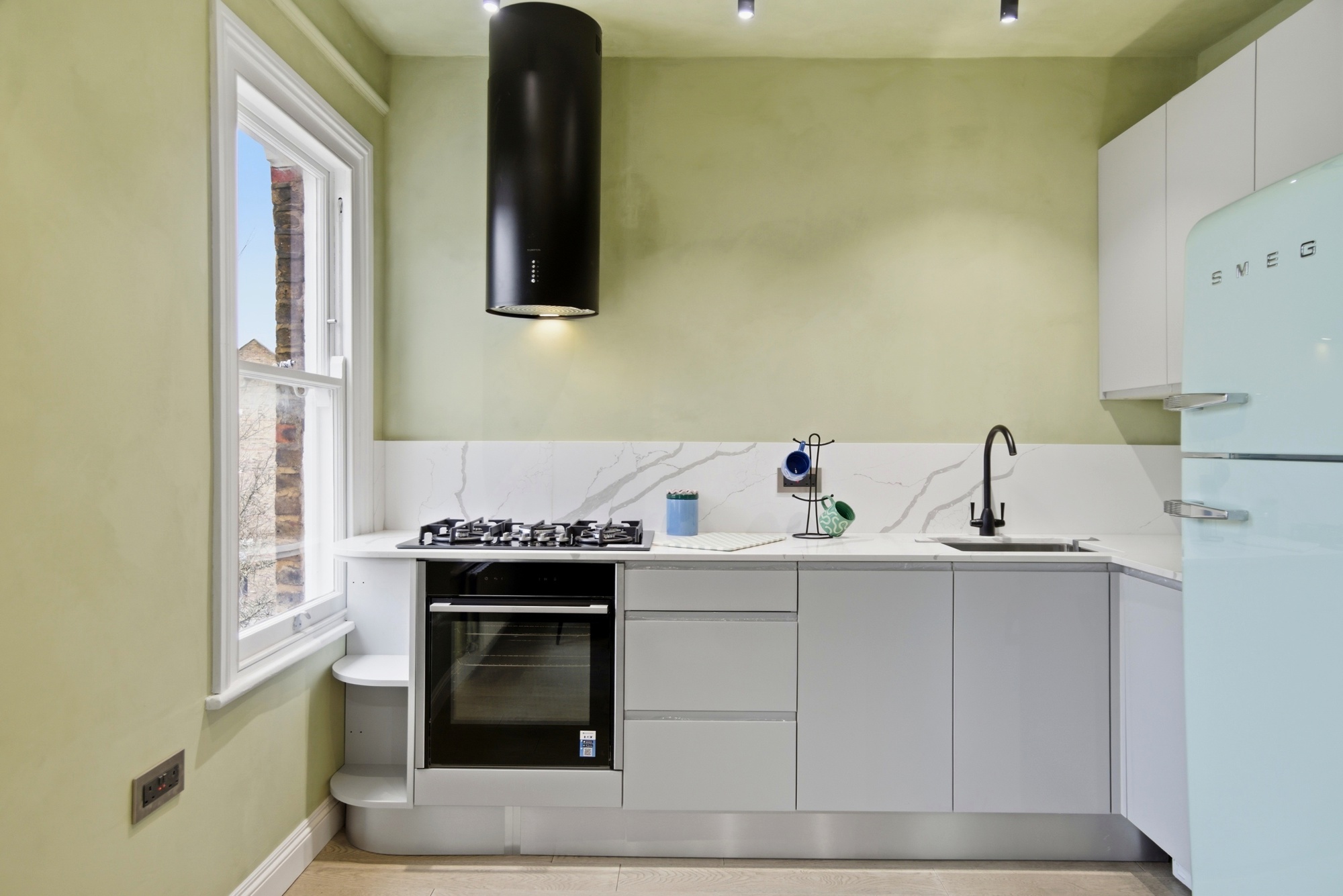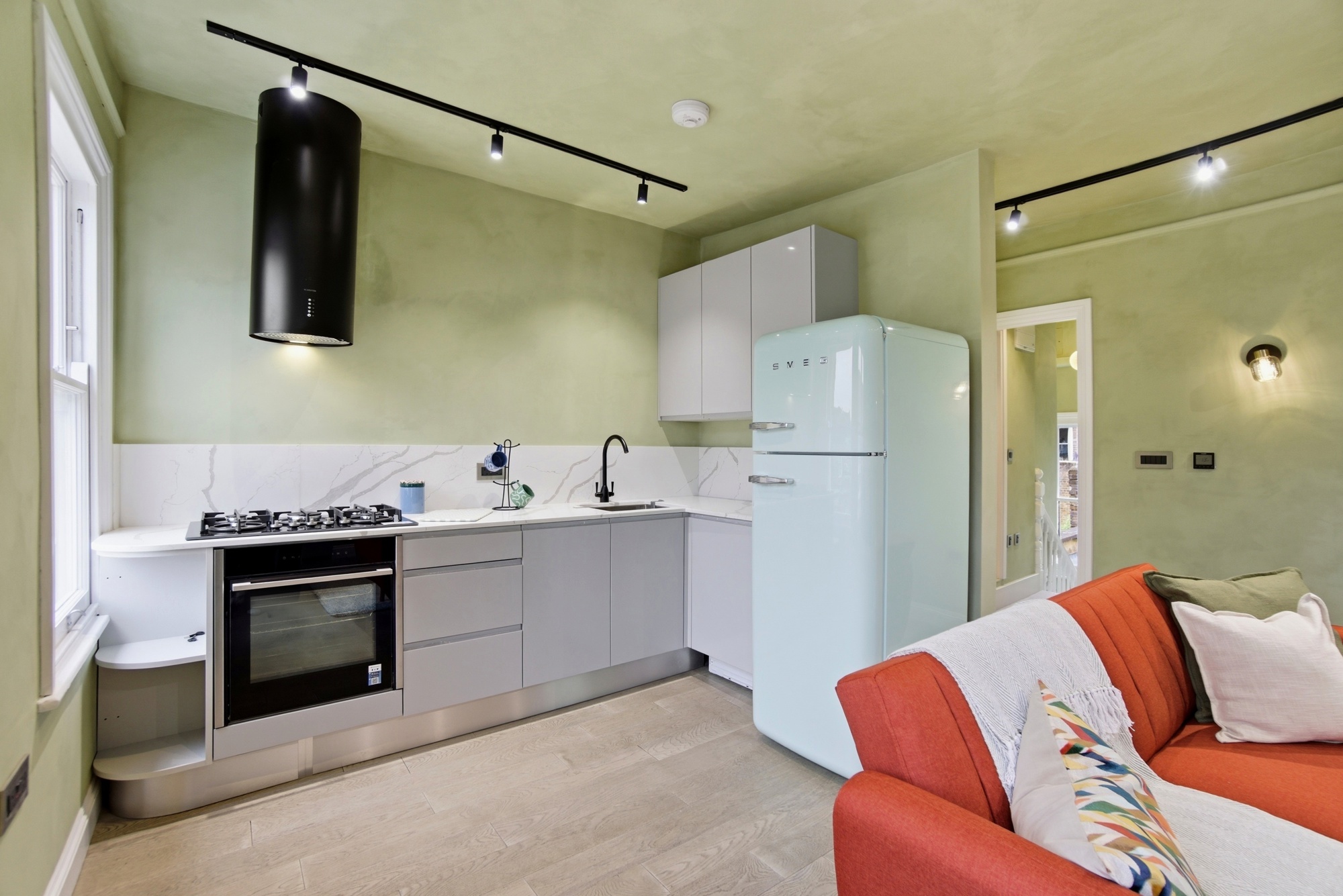 The bespoke kitchen is fitted with sleek cabinetry, marble-effect worktops and integrated appliances, combining practicality with refined design. A statement retro-style fridge adds character, while the layout maximises both storage and functionality within the space.